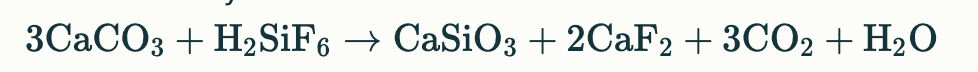 Esta reacción produce silicato cálcico (la capa endurecida), fluoruro cálcico (que también contribuye a la dureza) y libera dióxido de carbono y agua.