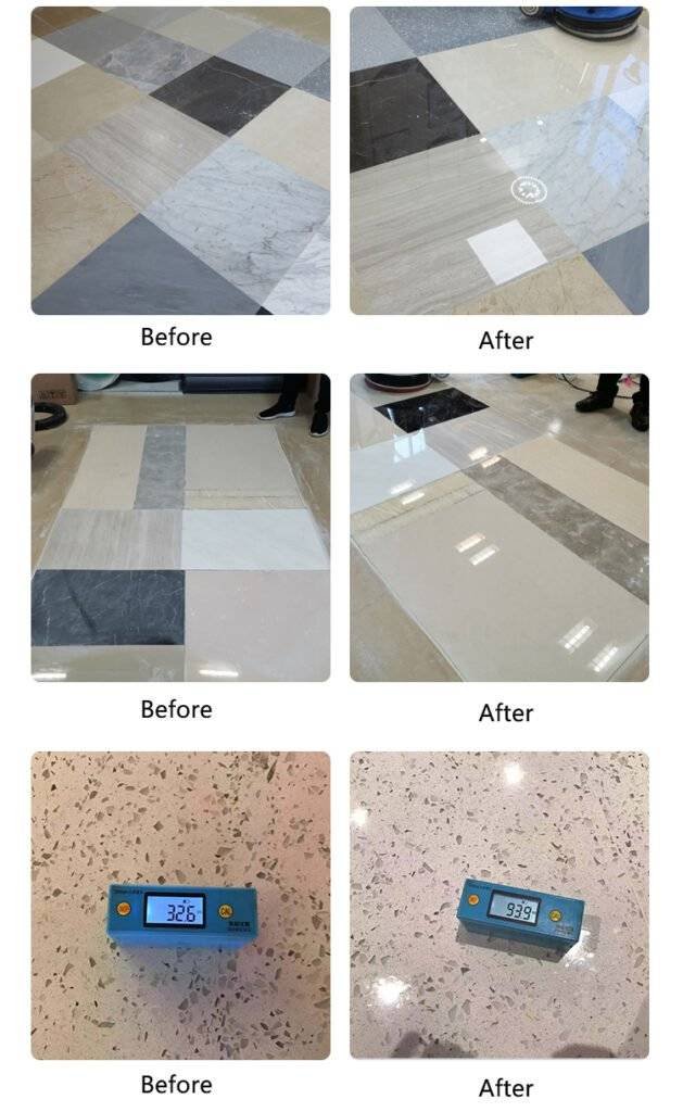 Un proceso de "endurecimiento físico + optimización de la superficie". Agentes cristalizadores especializados (principalmente silicato fluorado y ácidos orgánicos) reaccionan químicamente con los minerales de las superficies de piedra (especialmente piedras carbonatadas como el mármol y la caliza), formando una capa dura de vidrio microcristalino (normalmente de 5-10μm de grosor). El calor de fricción de las pulidoras de alta velocidad fusiona esta capa con la piedra, rellenando los microporos y aumentando la dureza.